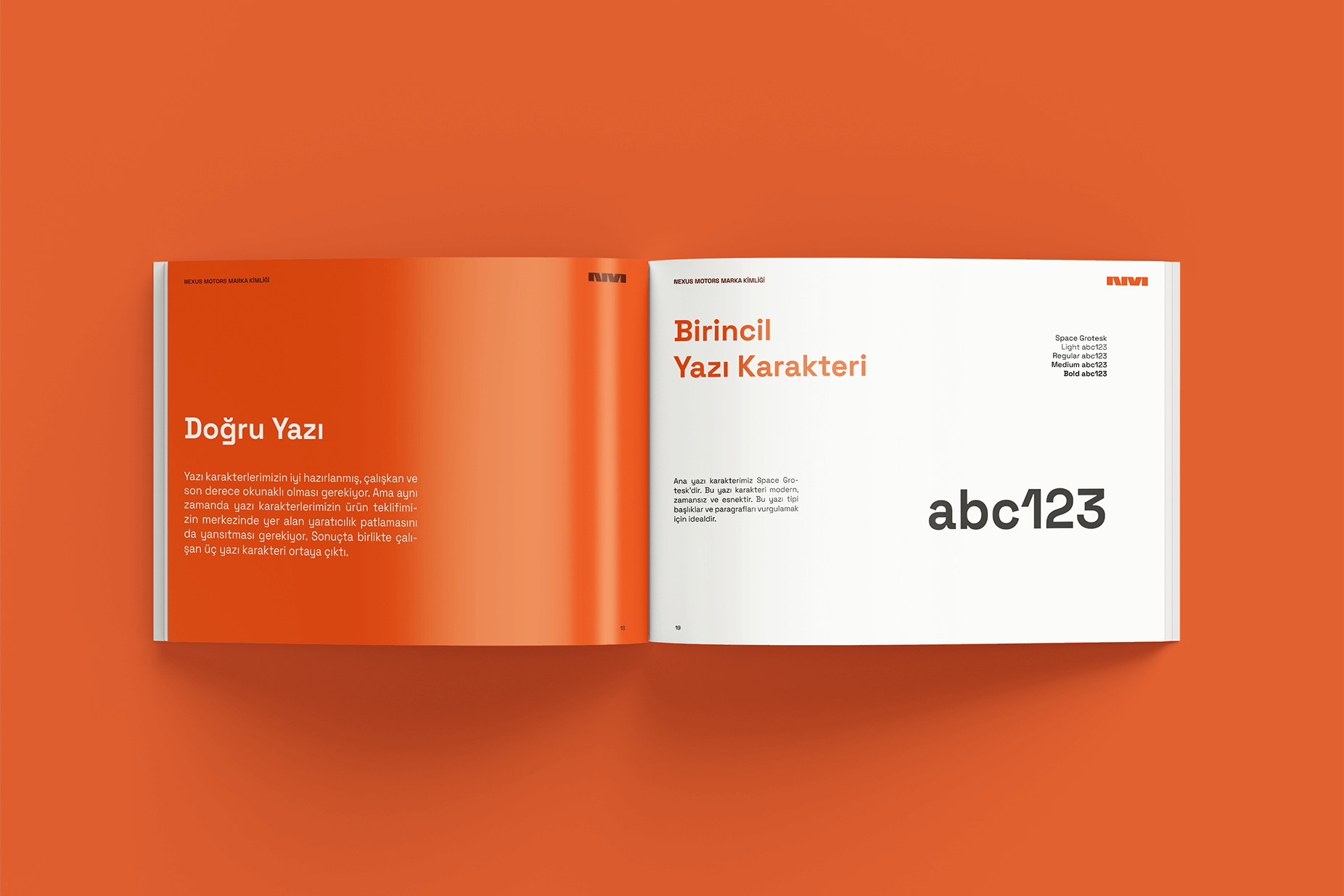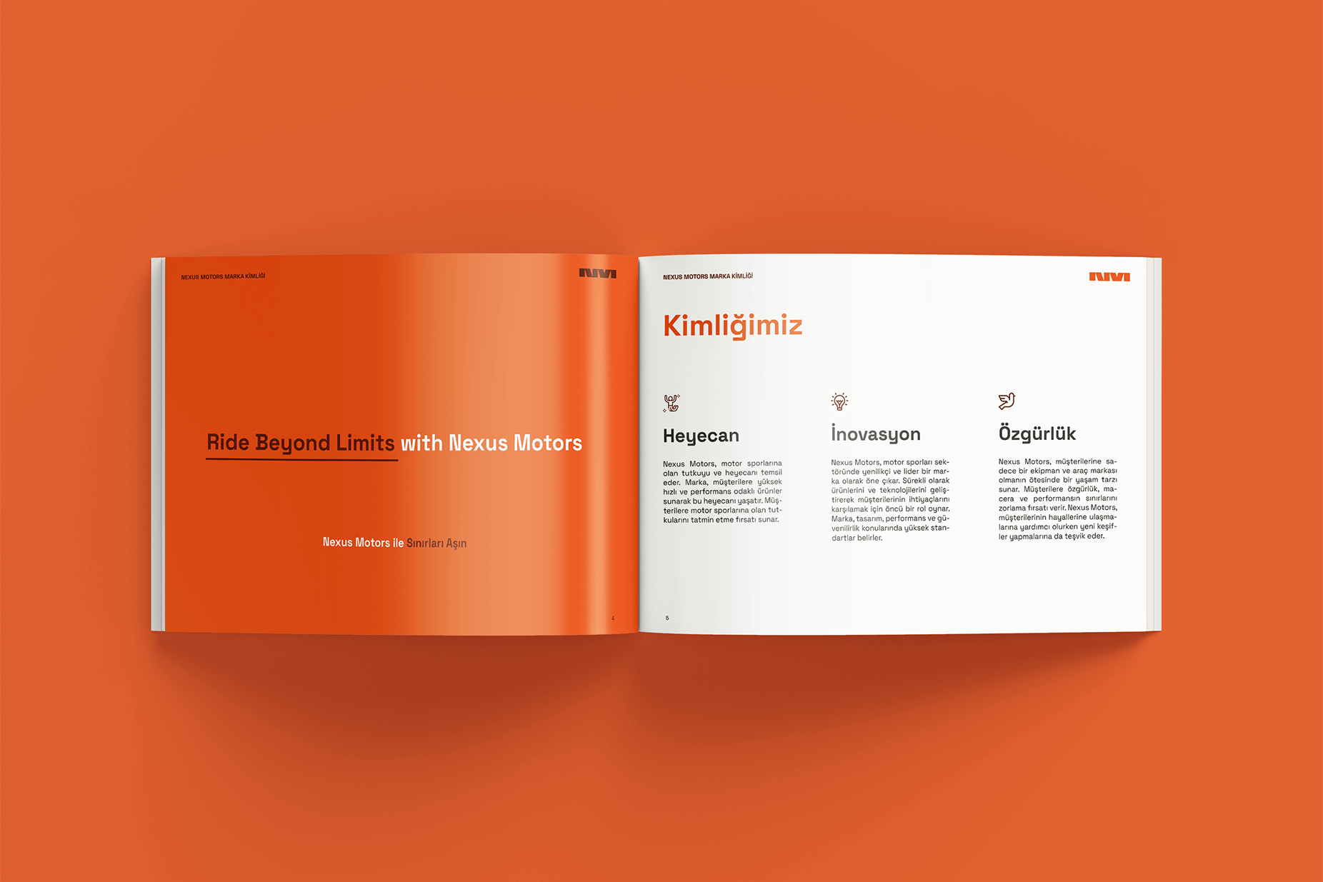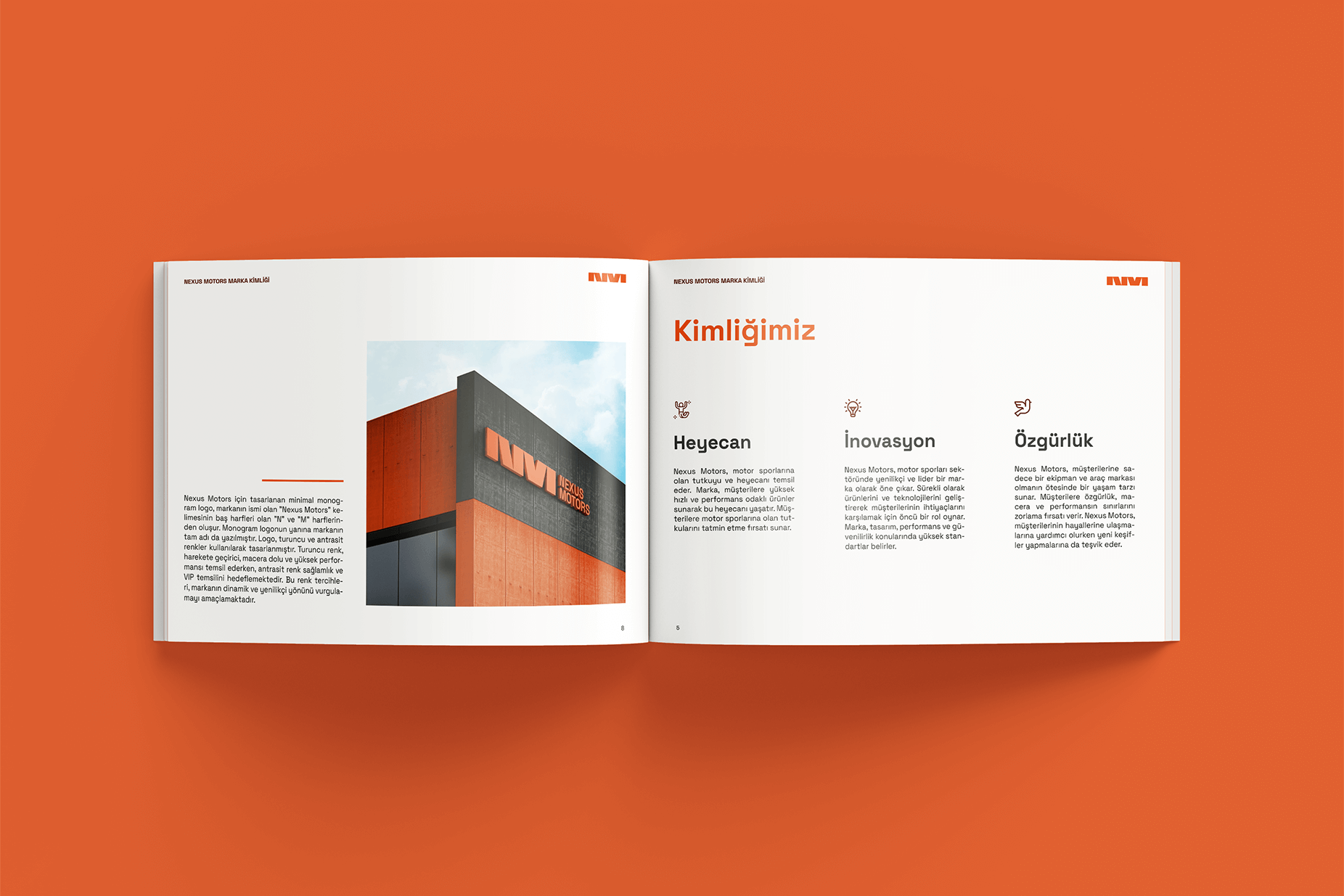 Logo, markanın hareketli ve güçlü karakterini simgeleyen minimalist bir monogram olarak tasarlandı. Turuncu ve antrasit renklerin kombinasyonu, markanın dinamizmini ve güvenilirliğini temsil ediyor. Bu iki rengin uyumu, performans ve sağlamlığı bir arada sunmayı hedefleyen Nexus Motors’un ruhunu yakalıyor.