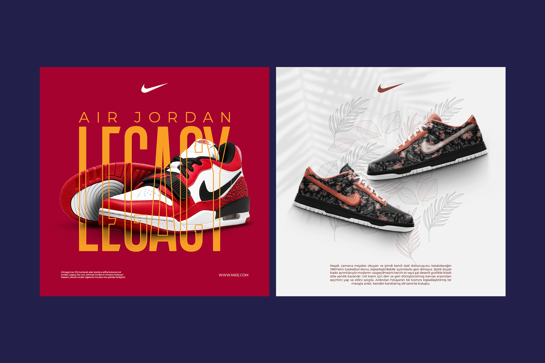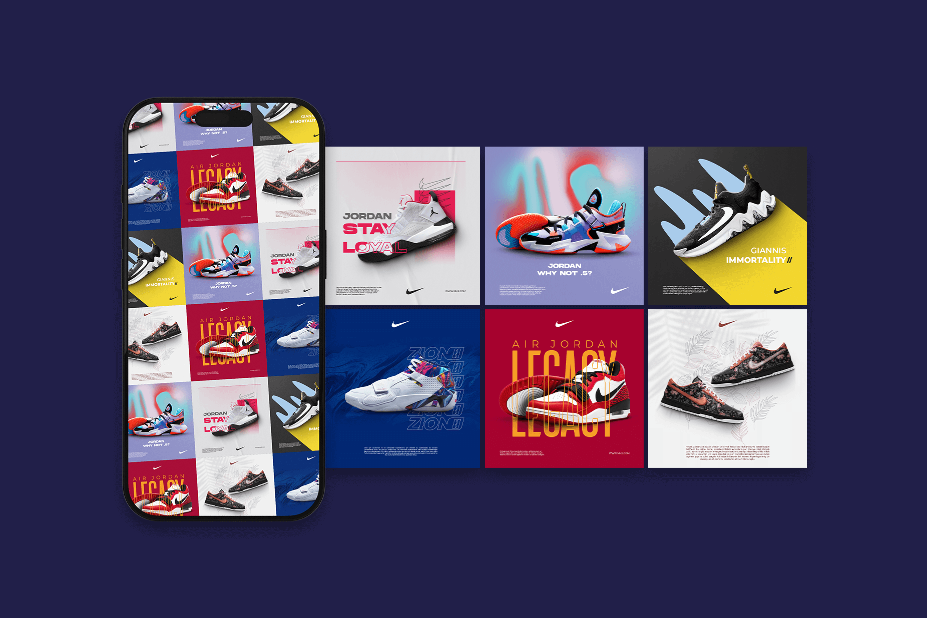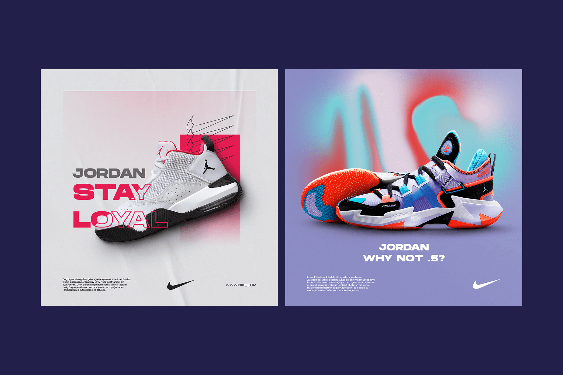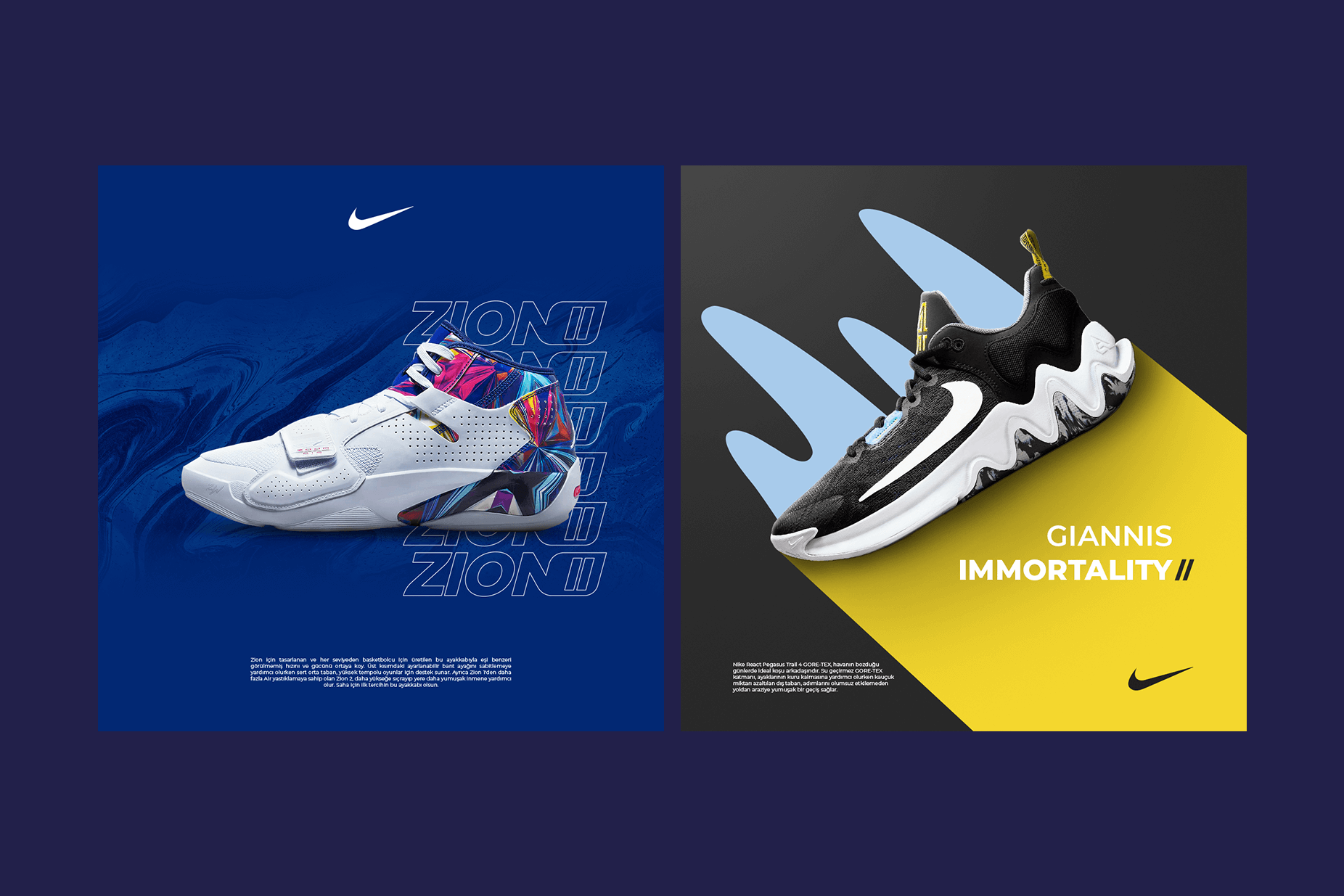 Modern spor ayakkabılar için hazırlanan dijital reklam konsepti. Marka imajını güçlendirmek ve ürünleri ön plana çıkarmak amacıyla yaratıcı tipografi, renk kullanımı ve minimalist düzenlemelerle oluşturulmuş bir görsel seri.